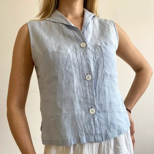 Sinoe Light Blue Linen Sleeveless Button-Down Top
