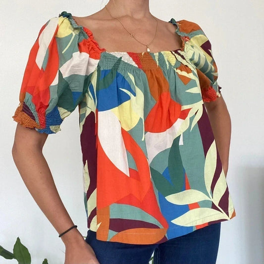 Vibrant Tropical Print Smocked Top | Bright Boho Puff Sleeves